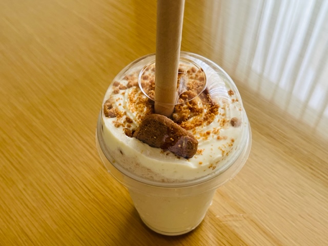 私は「Biscoff Cheese Frappe」(Rp52.000)を注文しました。お店でゆっくりと飲む時間がなくなってしまったので、結局テイクアウトしたのですが、快くビニール袋に包んでもらえました。甘さはそれほど強くなく、とても飲みやすいフラペチーノで、あっという間に飲んでしまいました。