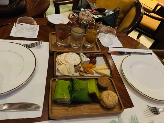 こちらは奥から、ジャムウ、チーズ、そしてインドネシアの伝統菓子です。紅茶は、茶葉の説明を受けて、その場で香りをかぎながら選ぶことができました。
